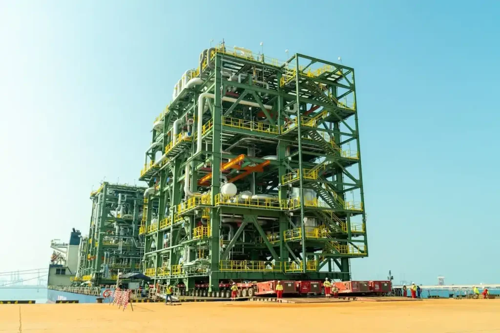 Entre os módulos transportados, o destaque foi para a unidade mais pesada e alta, um Módulo de Resfriamento de Gás de Processo. Esta peça monumental pesava 2.464 toneladas, medindo 38 metros de comprimento, 23 metros de largura e impressionantes 32 metros de altura. A movimentação dessa unidade exigiu uma coordenação meticulosa e o uso de tecnologia de ponta para garantir a segurança e a eficácia.