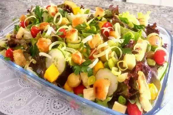 Temperar com sal e colocar folhas de alface (caso deseje) ao redor da salada.